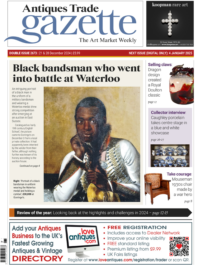 The front page of ATG No 2673 in December 2024, reporting the sale at Gorringe's of the portrait of a Waterloo bandsman now identified as Pte Thomas James by the National Army Museum.