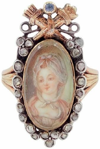The 35 lots include this 18th or 19th century silver, ivory, diamond and sapphire ring set with an oval miniature of a woman and surmounted with a ‘trophy of love’ symbol, modelled as a flaming torch and bow and quiver.