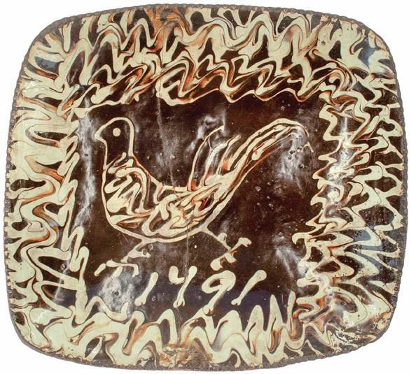 English slipware pottery dish decorated in a cream and brown slip with a stylised bird and dated 1791, estimate £1000-1500 at Lay’s. View the catalogue entry
