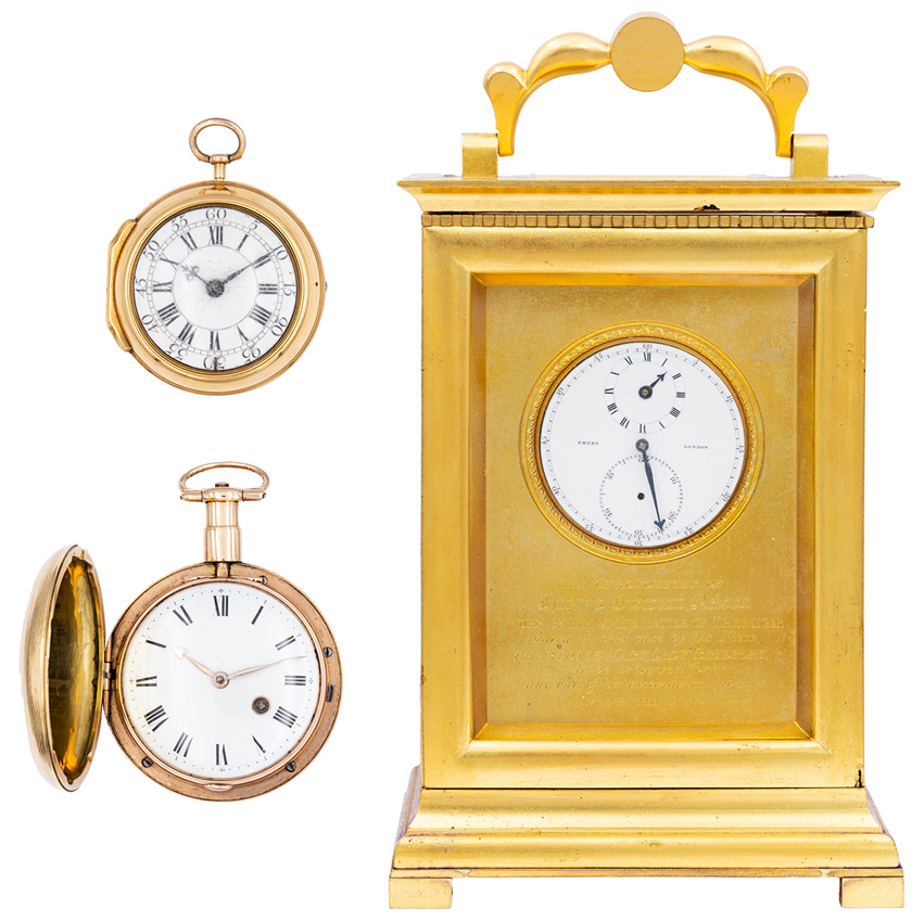 The pocket watches carried by Admiral Lord Viscount Nelson (shown mounted in a gilt carriage clock form case), Captain Thomas Masterman Hardy and Rear Admiral Cuthbert Collingwood at the Battle of Trafalgar. Estimate £800,000-£1.2m at Spink.