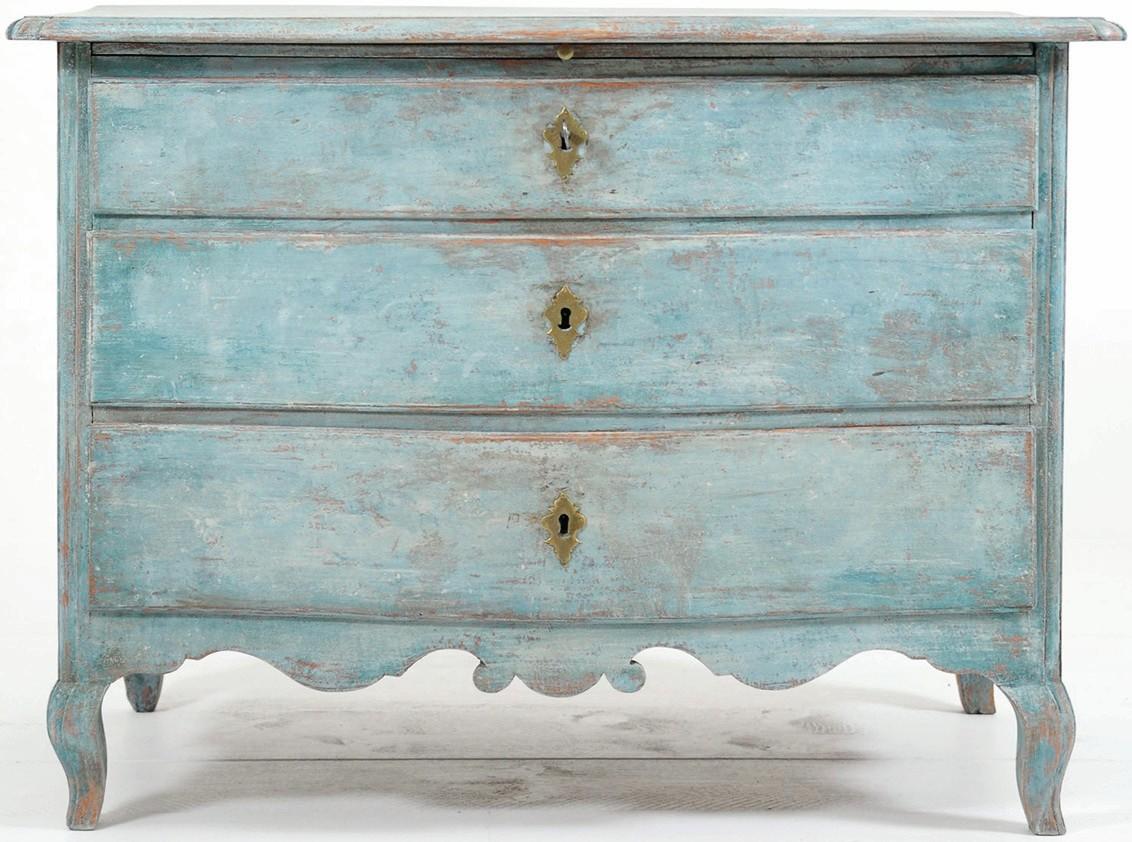 Newcomer at The Decorative Fair Louise Hall Decorative offers for £3650 this 1760s blue painted Rococo Swedish commode with original locks and key, three drawers and a scalloped front.
