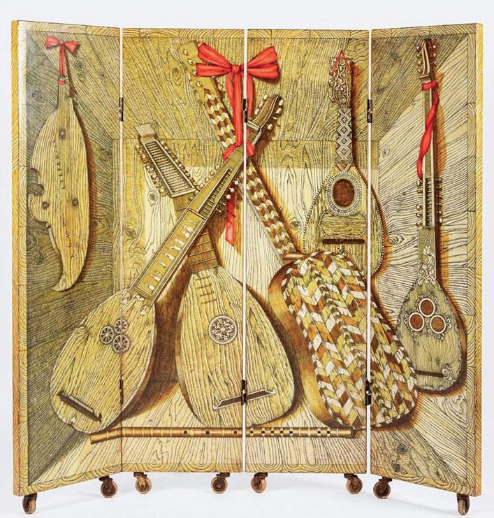 Priced £14,000 on the stand of Arenski at The Decorative Fair is this Fornasetti four-panel screen ‘Strumenti Musicali & Uccelli’, c.1953, which is decorated to one side with birds and to the other with musical instruments.